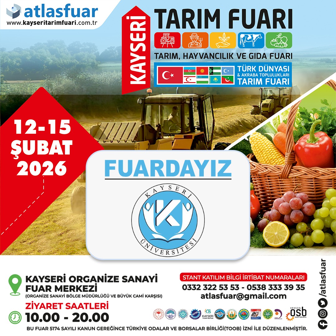 12–15 Şubat 2026 tarihleri arasında Kayseri’de düzenlenen Tarım Fuarı’na, Ata Tohum Uygulama ve Araştırma Merkezi ile Meslek Yüksekokulumuzun Bahçe Tarımı, Akıllı Sera Teknolojileri ile Tarım Makinaları ve Teknolojileri Programları katılım sağlamıştır.